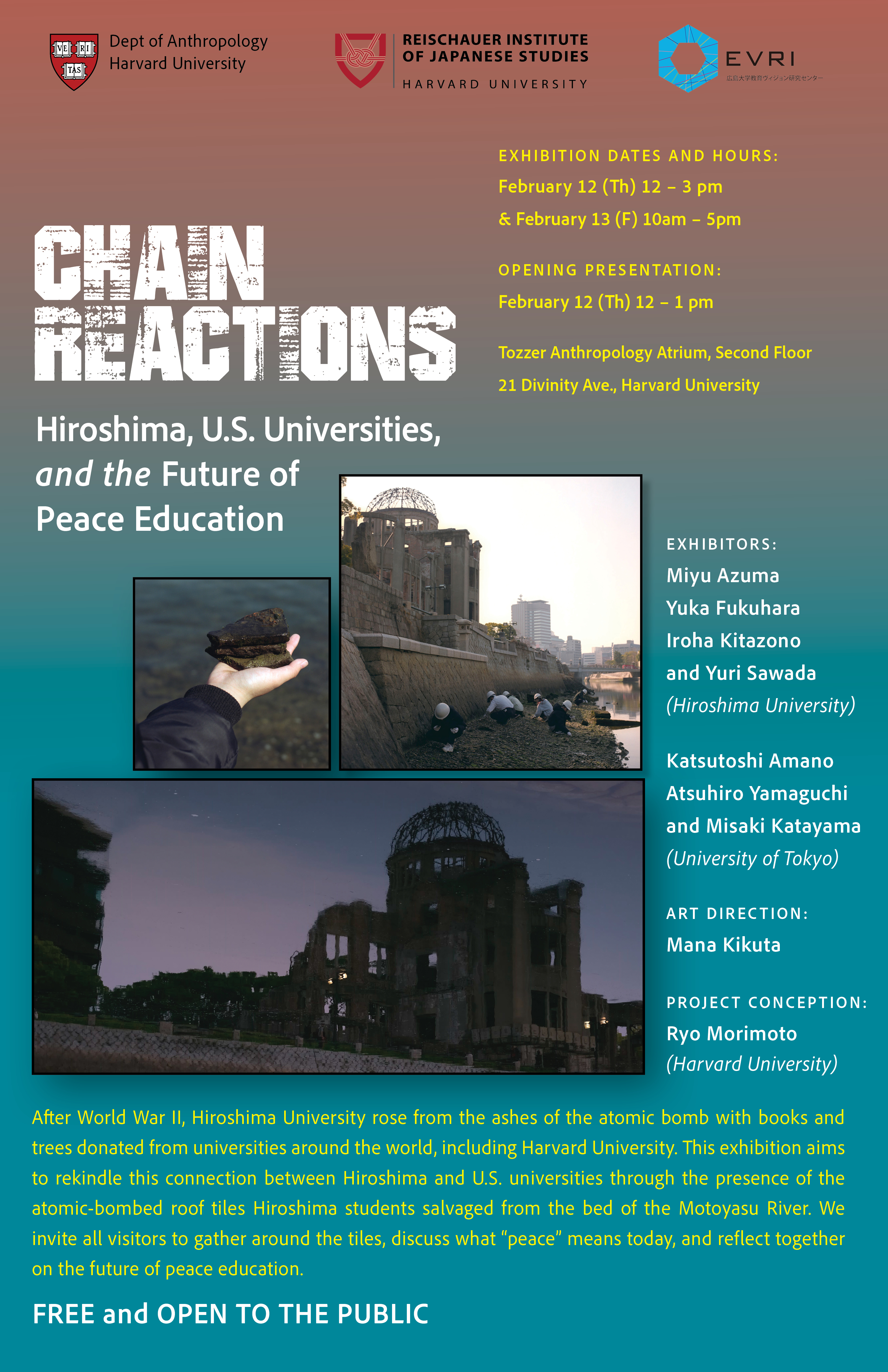 After World War II, Hiroshima University rose from the ashes of the atomic bomb with books and trees donated from universities around the world, including Harvard University. This exhibition aims to rekindle this connection between Hiroshima and U.S. universities through the presence of the atomic-bombed roof tiles Hiroshima students salvaged from the bed of the Motoyasu River. We invite all visitors to gather around the tiles, discuss what “peace” means today, and reflect together on the future of peace education.