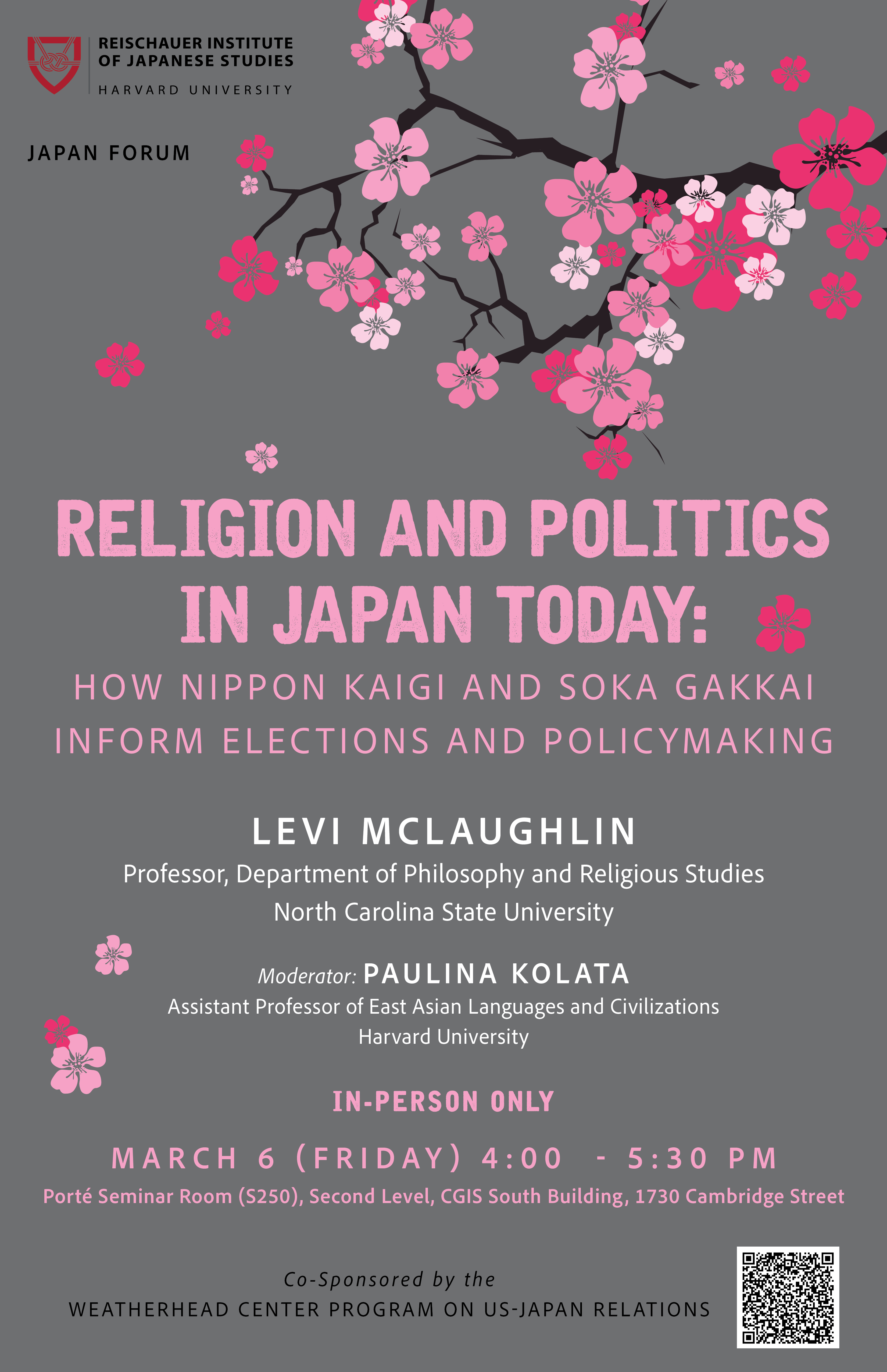 Faced with political upheaval, aging support bases, rising regional security concerns, and harsh economic realities, how are influential religion-linked activists now seeking to shape Japan? What are the impacts of their initiatives? Levi McLaughlin will draw on his recent ethnography to illuminate consequential ways participants in the influential Shinto-linked lobby organization Nippon Kaigi and adherents of the lay Buddhist organization Soka Gakkai are now restructuring their political engagements, from local-level communities up to the highest levels of government. This presentation will clarify reasons why we must attend to religion to understand support for and opposition to Japan’s popular Prime Minister Takaichi Sanae and her government, and it will point to ways religious affiliates will likely inform Japanese politics in the near future.
